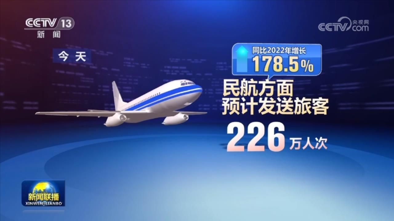 民航方面,今天預計發(fā)送旅客226萬人次,同比2022年增長178.5%。全國水路預計發(fā)送旅客115萬人次,同比2022年增長164.62%。