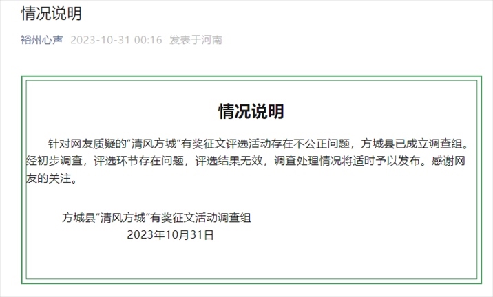 ·獲獎?wù)魑?2篇為同一作者,官方通報調(diào)查結(jié)果:評選環(huán)節(jié)存在問題,評選結(jié)果無效。