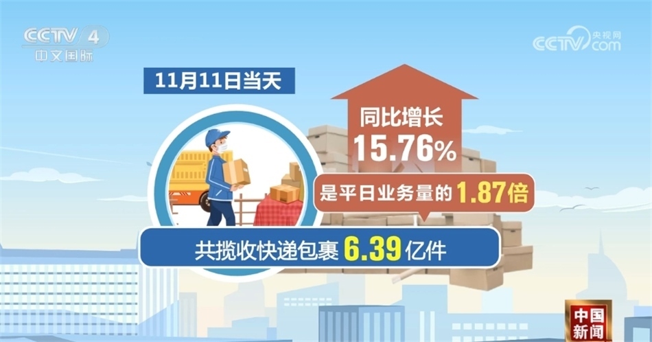 數(shù)據(jù)顯示,11月1日至11日,全國郵政快遞企業(yè)共攬收快遞包裹52.64億件,同比增長23.22%,日均業(yè)務(wù)量是平日業(yè)務(wù)量的1.4倍。其中11月11日當(dāng)天,共攬收快遞包裹6.39億件,是平日業(yè)務(wù)量的1.87倍,同比增長15.76%。