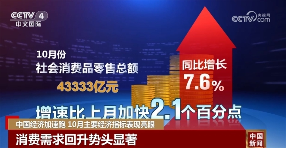 央視網(wǎng)消息:來關(guān)注中國經(jīng)濟(jì)10月報(bào)。國家統(tǒng)計(jì)局昨天(11月15日)發(fā)布了10月份經(jīng)濟(jì)主要指標(biāo)。數(shù)據(jù)顯示,隨著宏觀調(diào)控政策持續(xù)發(fā)力顯效,全國生產(chǎn)供給穩(wěn)中有升,市場(chǎng)需求持續(xù)改善,就業(yè)物價(jià)總體穩(wěn)定,高質(zhì)量發(fā)展扎實(shí)推進(jìn),國民經(jīng)濟(jì)持續(xù)恢復(fù)向好。