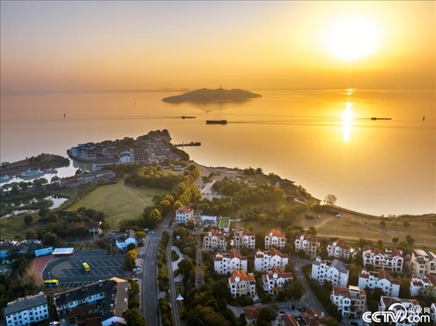 2023年11月14日,合肥,夕陽(yáng)西下,裝載貨物的船只在合裕線航道巢湖湖區(qū)有序航行。
