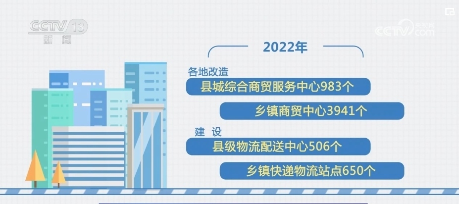 2022年,各地改造縣城綜合商貿(mào)服務中心983個、鄉(xiāng)鎮(zhèn)商貿(mào)中心3941個,建設縣級物流配送中心506個、鄉(xiāng)鎮(zhèn)快遞物流站點650個。