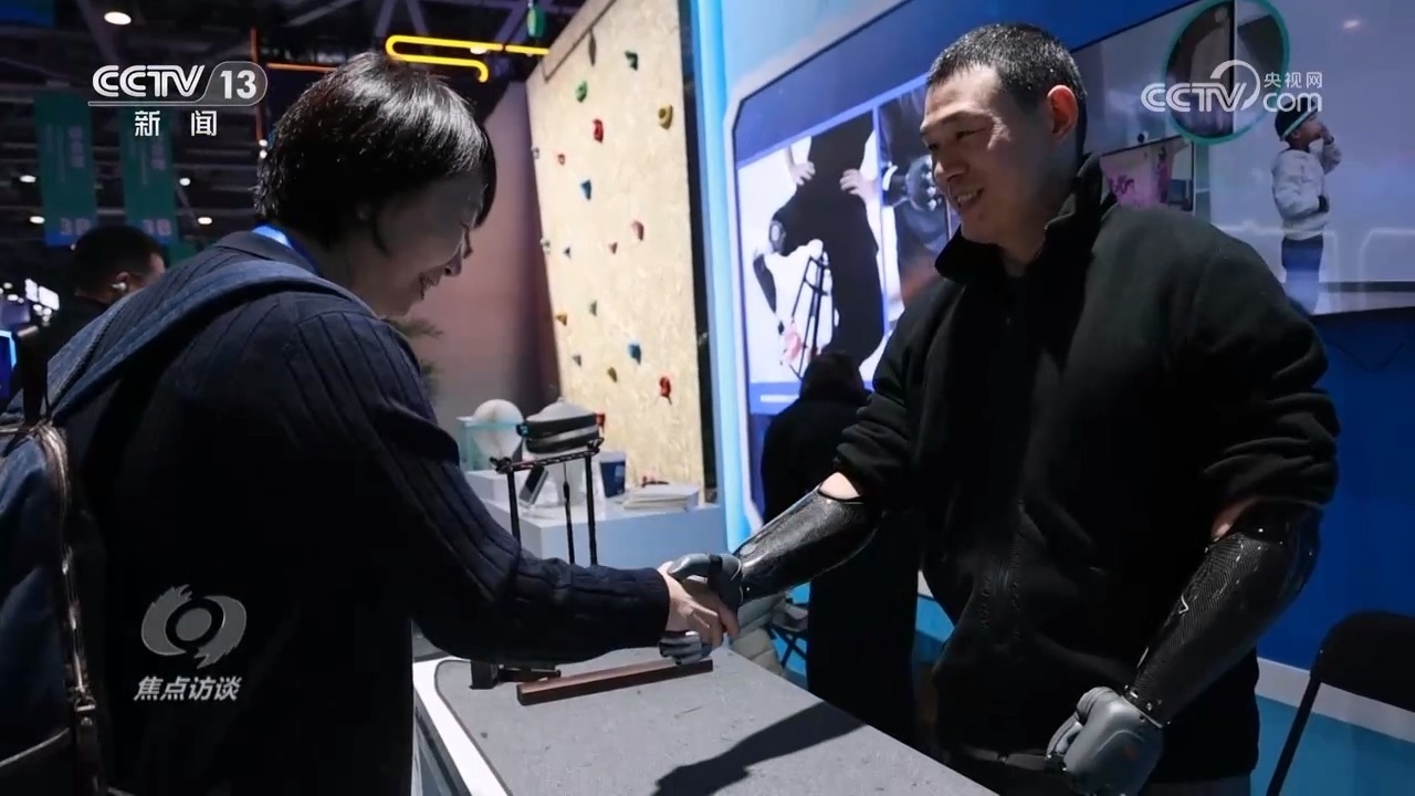 博覽會現(xiàn)場,一位坐在角落里的中年男子引起了我們的注意。他叫倪敏成,九歲時因為意外失去雙手,但讓他更感意外的是,30年后,腦機(jī)接口技術(shù)讓他重新?lián)碛辛艘浑p智能仿生手。