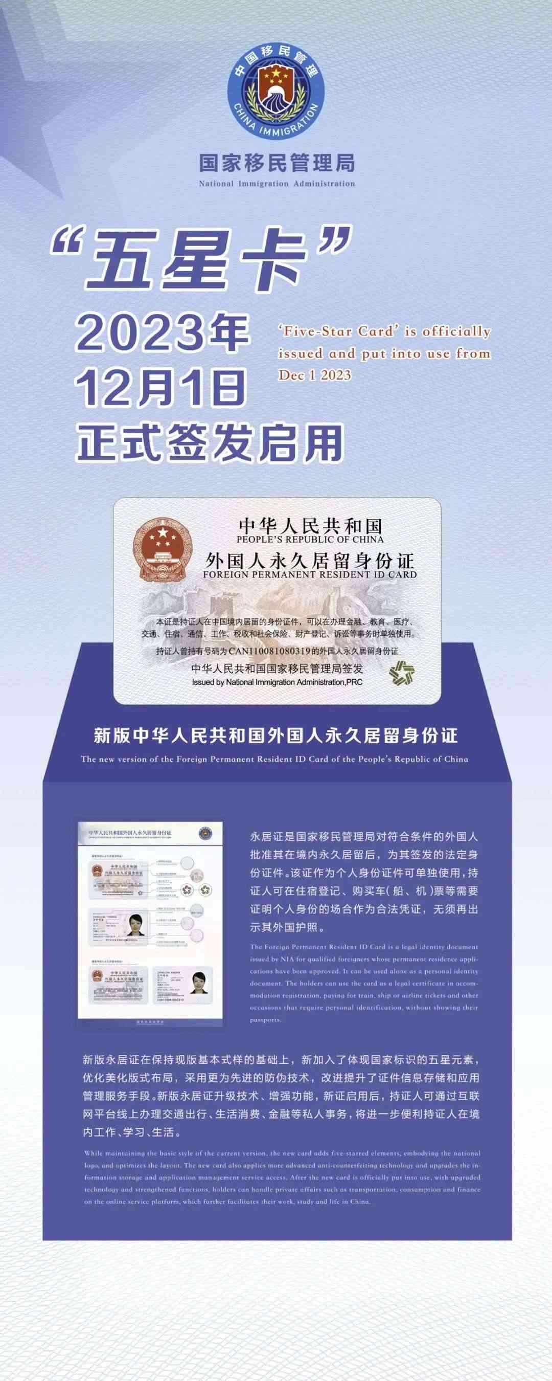 央視網(wǎng)消息:據(jù)國家移民管理局,新版中華人民共和國外國人永久居留身份證12月1日正式簽發(fā)啟用。因加入了體現(xiàn)國家標(biāo)識的五星元素,新版永居證被稱為“五星卡”。首日共有50名取得在華永久居留資格的外國人領(lǐng)取到了首批“五星卡”。他們來自美國、德國、英國、法國、俄羅斯、瑞典、新加坡、韓國等二十余個國家,均為在經(jīng)濟、教育、科技、文化、衛(wèi)生等多個領(lǐng)域為中國經(jīng)濟社會發(fā)展做出了突出貢獻人員,當(dāng)中包括中國政府友誼獎獲得者,在華長期任職工作的外籍高層次管理和專業(yè)技術(shù)人員,在重點院校、科研機構(gòu)長期從事教學(xué)科研的外籍教授學(xué)者等。當(dāng)天,在北京、天津、上海、廣東等地公安機關(guān)出入境辦證窗口,還有不少永久居留外國人前來咨詢申請換發(fā)“五星卡”。
