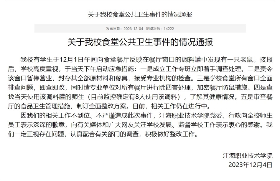 ·揚州一高校通報食堂麻醬罐發(fā)現(xiàn)老鼠:成立專班調查處理,涉事窗口停業(yè)。