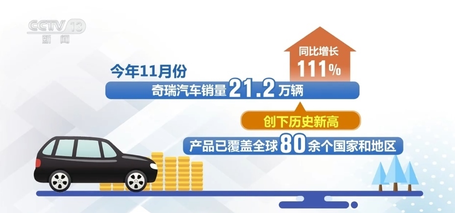 最新數(shù)據(jù)顯示,2023年11月份,奇瑞汽車銷量21.2萬輛,同比增長(zhǎng)111%,創(chuàng)下歷史新高,產(chǎn)品已覆蓋全球80余個(gè)國(guó)家和地區(qū)。