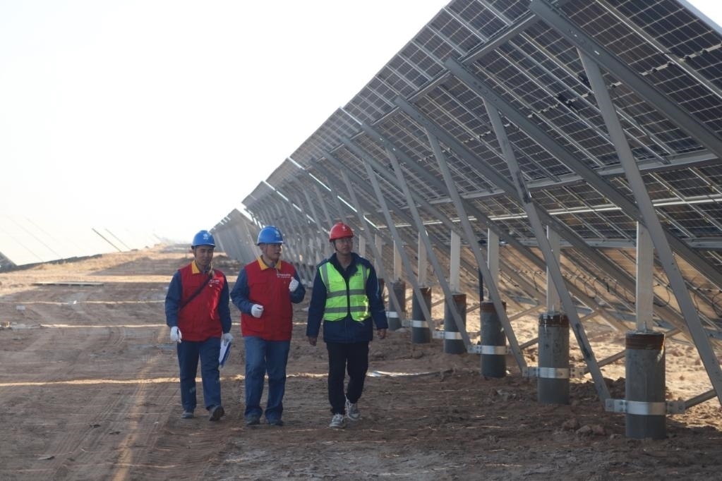 12月8日,國(guó)網(wǎng)阿克蘇供電公司工作人員來(lái)到國(guó)家電投阿拉爾光伏一電站進(jìn)行隱患排查。(馬海驕 攝)