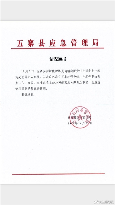 ·國新能源煤炭運(yùn)銷公司發(fā)生墜亡事故,山西省忻州市五寨縣官方:展開調(diào)查。