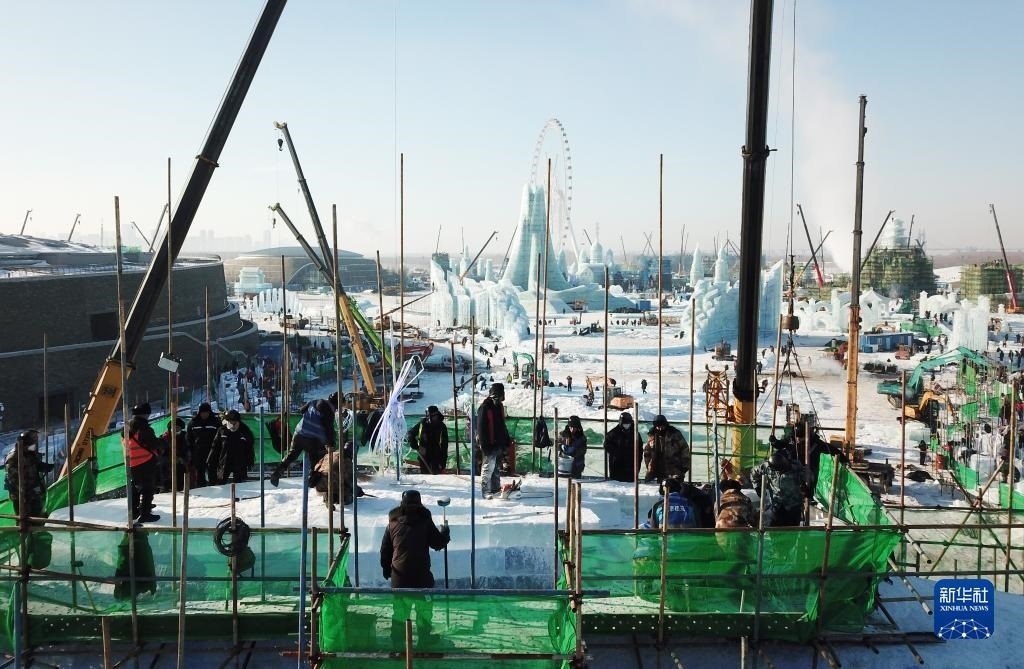 12月12日,在黑龍江省哈爾濱市冰雪大世界建設(shè)現(xiàn)場(chǎng),工人在零下20多攝氏度的低溫下施工作業(yè)(無人機(jī)照片)。