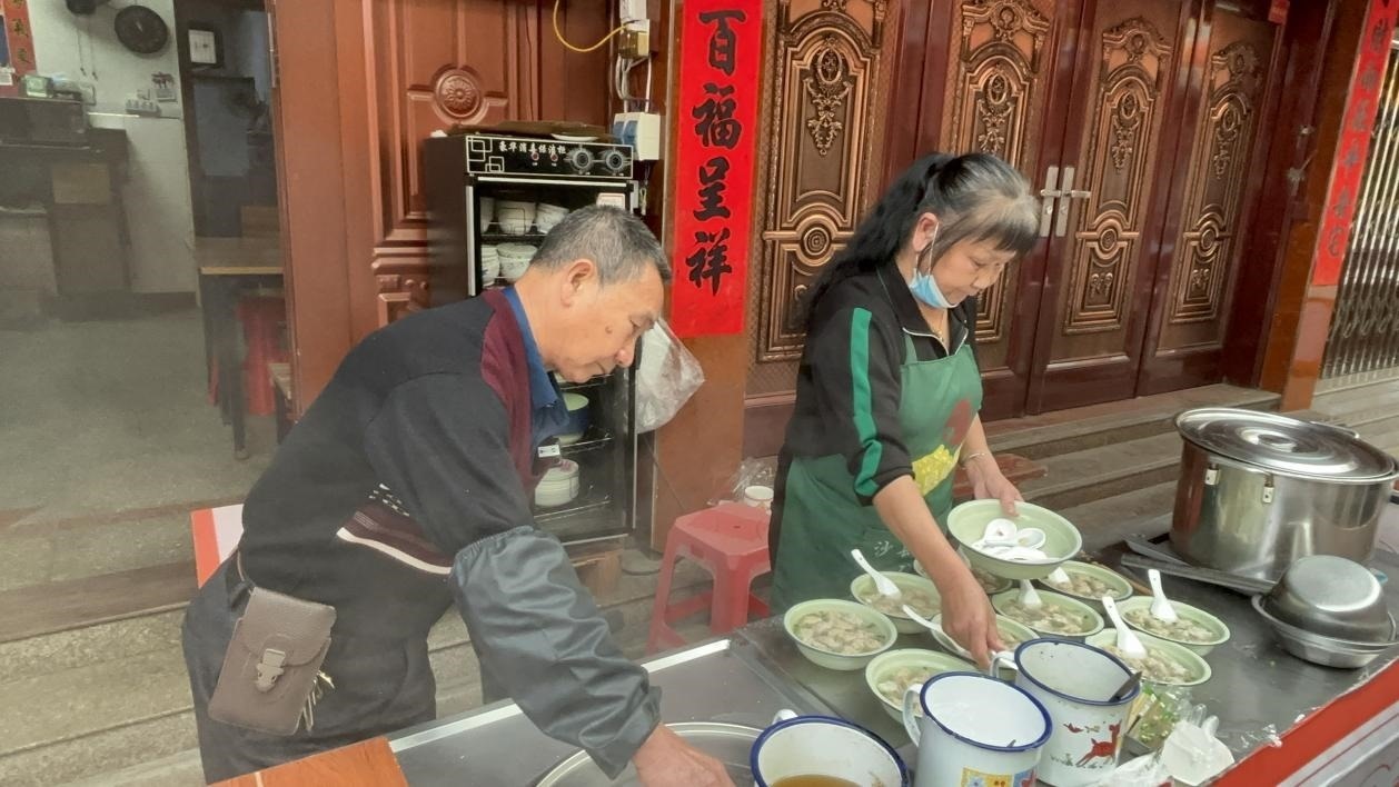 沙縣小吃業(yè)主、手打扁肉技藝傳承人給客人現(xiàn)場(chǎng)制作小吃扁肉。