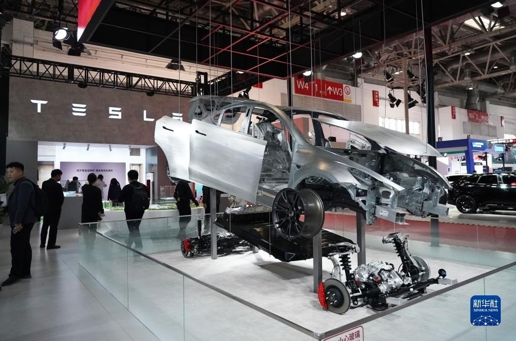 這是首屆中國國際供應(yīng)鏈促進(jìn)博覽會智能汽車鏈展區(qū)的特斯拉展位(2023年11月30日攝)。新華社記者 任超 攝