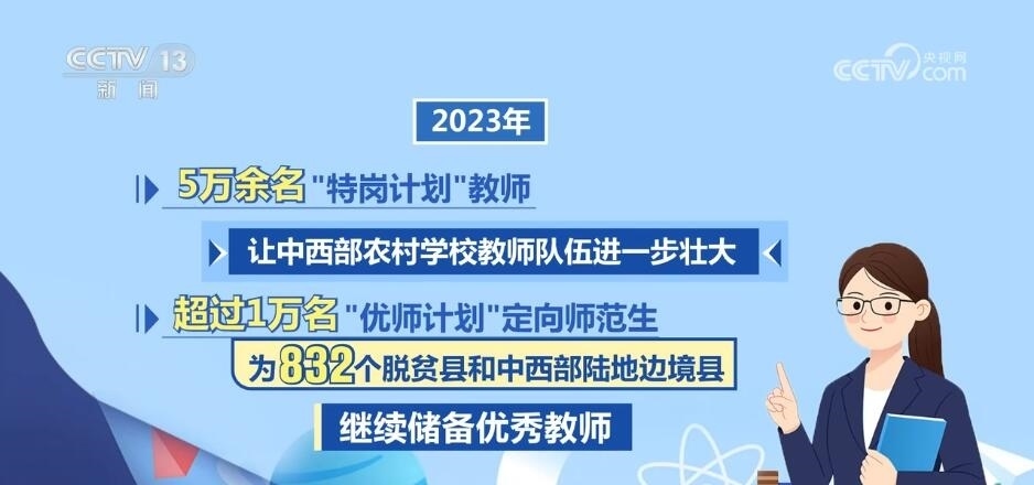 強(qiáng)教必先強(qiáng)師。2023年,5萬余名“特崗計劃”教師讓中西部農(nóng)村學(xué)校教師隊伍進(jìn)一步壯大,超過1萬名“優(yōu)師計劃”定向師范生為832個脫貧縣和中西部陸地邊境縣繼續(xù)儲備優(yōu)秀教師。
