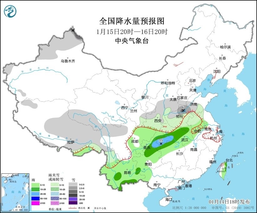 1月14日20時至15日20時,新疆北疆西北部、西藏東部、甘肅東部、陜西、山西南部、河南等地的部分地區(qū)有小到中雪,其中新疆阿勒泰、陜西南部、河南西部等地的部分地區(qū)有大雪,局地暴雪(10~12毫米),陜西南部、湖北西北部局地有凍雨;西南地區(qū)東部、江漢中西部、江南西部和東北部、廣西西部和北部、云南南部、海南島等地有小到中雨,其中重慶中北部等地局地有大雨(25~35毫米)。山東半島、江南東北部、西藏等地的部分地區(qū)有4~6級風(fēng),其中浙江東部沿海、西藏中部的部分地區(qū)風(fēng)力可達7級以上(見圖1);臺灣海峽有7~8級、陣風(fēng)9級的東北風(fēng),黃海、東海大部、南海中北部和西南部有5~7級風(fēng),陣風(fēng)8級。