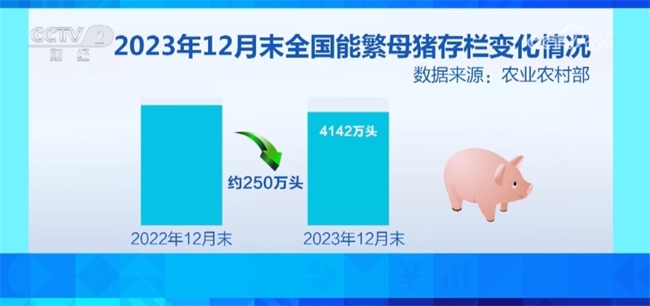 針對(duì)生豬產(chǎn)能偏高、養(yǎng)殖持續(xù)虧損的問(wèn)題,農(nóng)業(yè)農(nóng)村部指導(dǎo)各地加強(qiáng)生豬產(chǎn)能調(diào)控,引導(dǎo)養(yǎng)殖場(chǎng)戶(hù)適應(yīng)性調(diào)減產(chǎn)能,順時(shí)順勢(shì)出欄肥豬,加快供需回歸均衡。2023年12月末,全國(guó)能繁母豬存欄量4142萬(wàn)頭,比2022年12月末的階段性高點(diǎn)減少約250萬(wàn)頭。