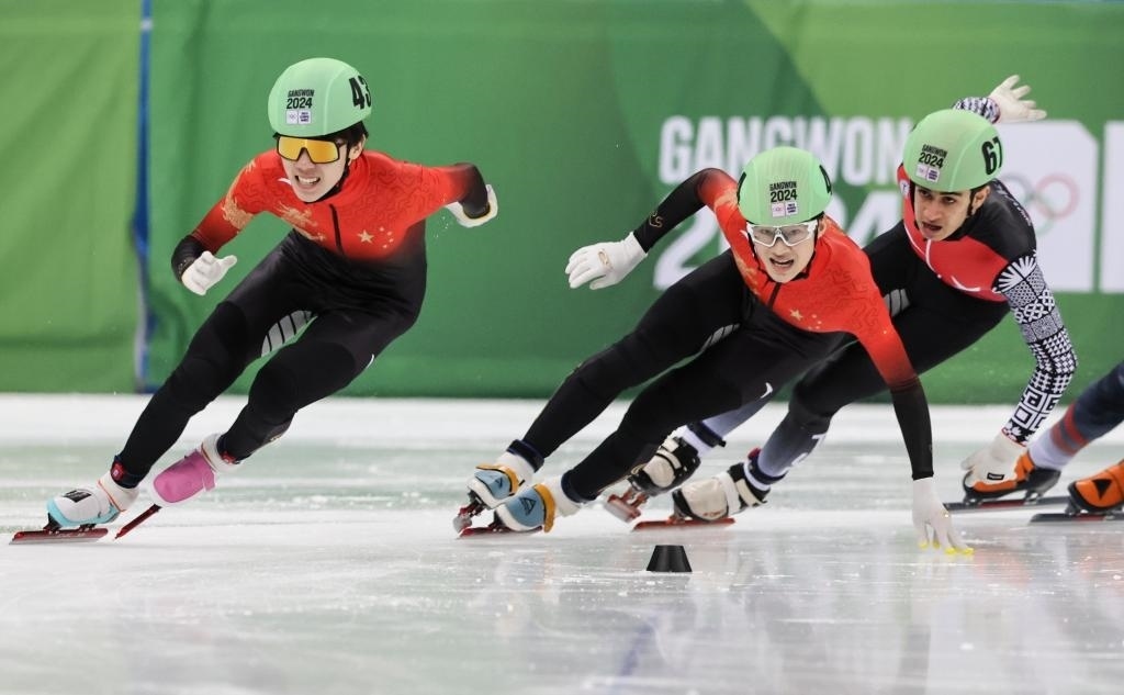 1月21日,張心喆(中)和隊友張柏浩(左)在男子1000米決賽中。新華社記者 姚琪琳 攝