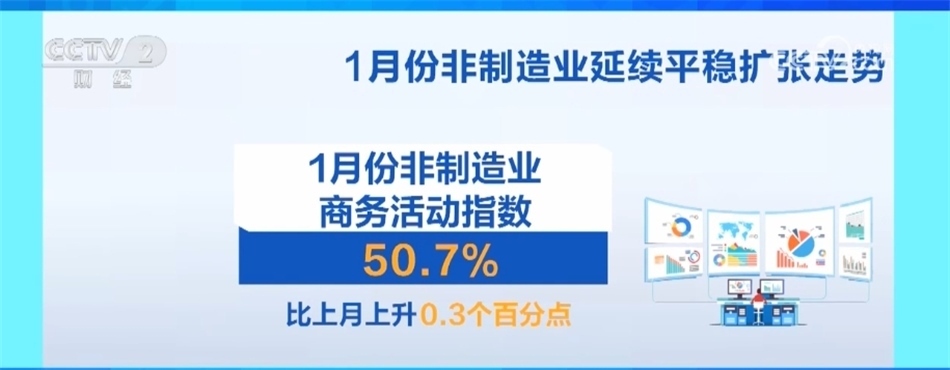 此外,1月份非制造業(yè)商務(wù)活動指數(shù)為50.7%,比上月上升0.3個百分點,延續(xù)平穩(wěn)擴(kuò)張走勢。其中,服務(wù)業(yè)商務(wù)活動指數(shù)升至擴(kuò)張區(qū)間,景氣面也有所擴(kuò)大。在節(jié)日效應(yīng)帶動下,零售、道路運輸、餐飲等行業(yè)商務(wù)活動指數(shù)升至擴(kuò)張區(qū)間。郵政、貨幣金融服務(wù)等行業(yè)業(yè)務(wù)量增長較快。