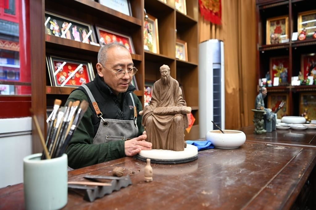 在天津古文化街,泥人張制作部的師傅劉強在店內工作。新華社記者李然 攝