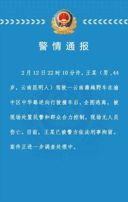 ·重慶解放碑一男子駕車逆行撞車后企圖逃離被刑拘,警方通報。