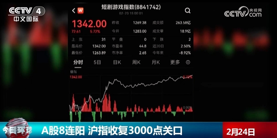 2月23日A股再度發(fā)力,上證指數收報3004.88點,漲幅0.55%;深證成指收漲0.28%。滬指“八連陽”收復了3000點整數關口。?