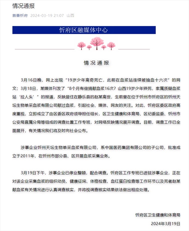 ·山西忻州通報(bào)“19歲少年生前被連續(xù)抽血16次”:已展開調(diào)查。