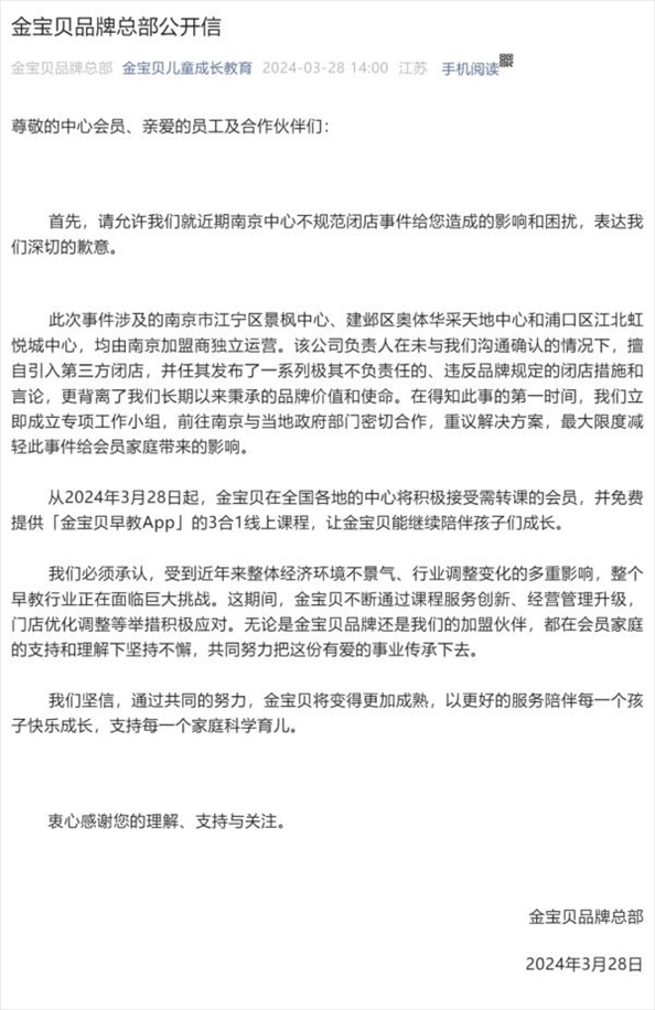 ·連鎖早教機(jī)構(gòu)金寶貝多地門店停業(yè),家長(zhǎng)遭遇退款難,金寶貝總部回應(yīng)致歉。