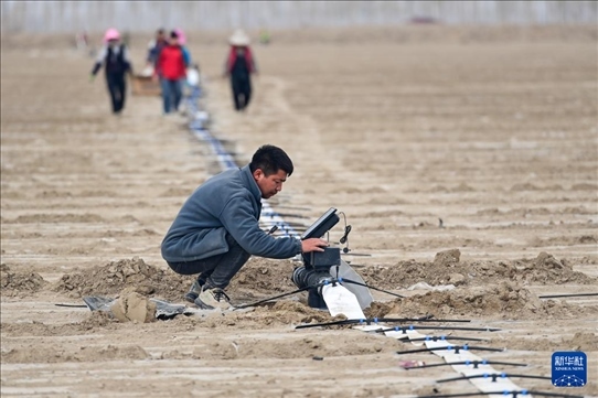 在新疆阿克蘇地區(qū)阿瓦提縣高標準農(nóng)田核心示范區(qū),農(nóng)業(yè)技術(shù)員在調(diào)試水肥一體化灌溉系統(tǒng)(3月27日攝)。