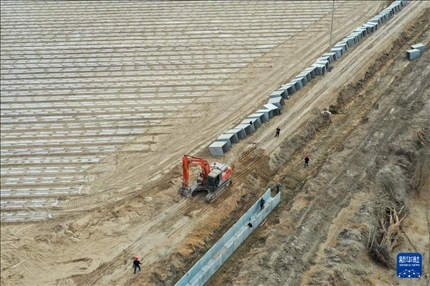 在新疆阿克蘇地區(qū)阿瓦提縣高標準農(nóng)田核心示范區(qū),施工人員在棉田外修建防滲渠(3月27日攝,無人機照片)。