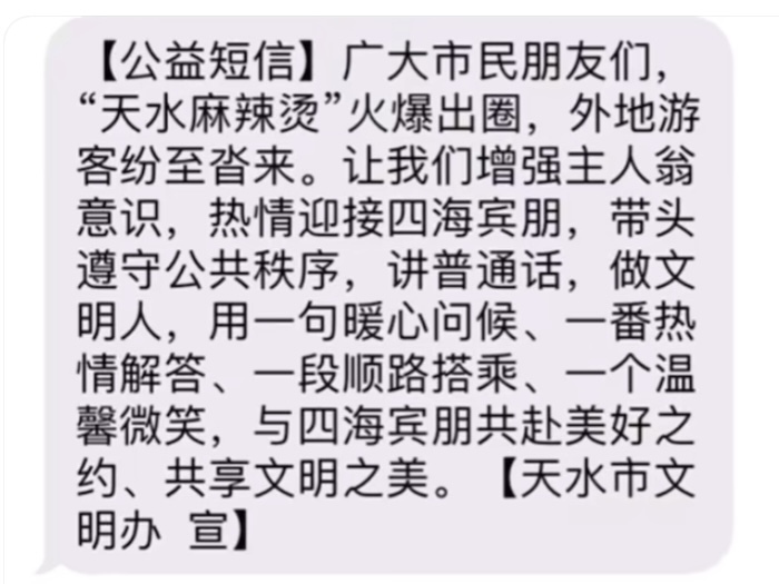 事實(shí)上,自3月以來天水在網(wǎng)絡(luò)“出圈”后,游客就絡(luò)繹不絕。有多位當(dāng)?shù)鼐W(wǎng)友“曬”的消息顯示,3月20日收到天水市發(fā)布的“公益短信”,建議當(dāng)?shù)厥忻瘛霸鰪?qiáng)主人翁意識,熱情迎接四海賓朋……用一句暖心問候、一番熱情解答、一段順路搭乘、一個(gè)溫馨微笑,與四海賓朋共赴美好之約……”