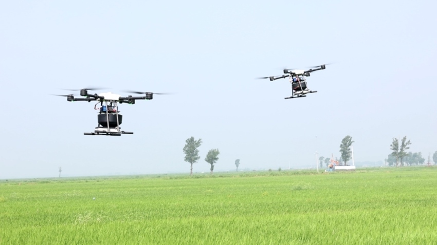 遙控無人機參與科學種植。公主嶺市委宣傳部供圖