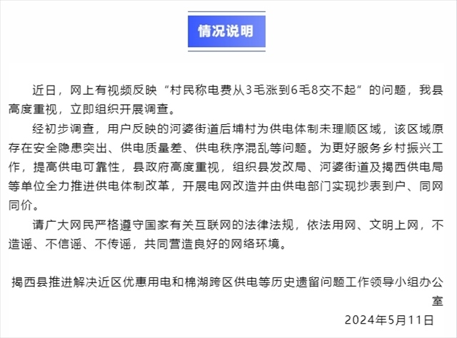 ·廣東揭陽(yáng)一村電費(fèi)從3毛漲到6毛8?官方回應(yīng):開(kāi)展電網(wǎng)改造并實(shí)現(xiàn)抄表到戶、同網(wǎng)同價(jià)。