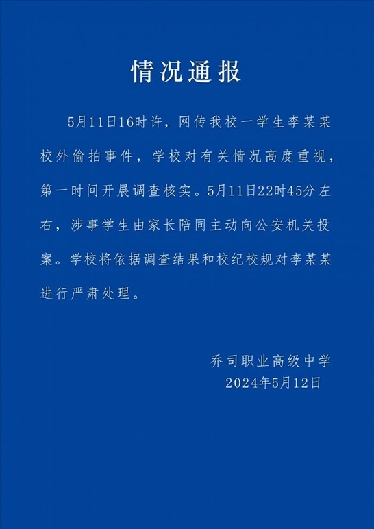 ·杭州市一職高通報(bào)學(xué)生校外偷拍女生裙底事件:涉事學(xué)生由家長(zhǎng)陪同主動(dòng)投案。