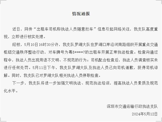 ·深圳出租車(chē)司機(jī)稱(chēng)執(zhí)法人員隨意攔車(chē)?官方發(fā)布情況通報(bào)。