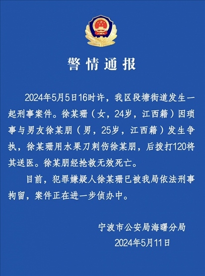 ·寧波警方通報(bào)女子因瑣事刺死男友:犯罪嫌疑人已被刑拘。