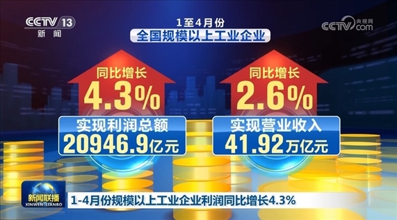央視網(wǎng)消息(新聞聯(lián)播):記者今天(5月27日)從國家統(tǒng)計(jì)局發(fā)布的最新數(shù)據(jù)了解到,1—4月份,全國規(guī)模以上工業(yè)企業(yè)實(shí)現(xiàn)利潤總額20946.9億元,同比增長4.3%;實(shí)現(xiàn)營業(yè)收入41.92萬億元,同比增長2.6%。企業(yè)利潤繼續(xù)保持平穩(wěn)增長,企業(yè)營收持續(xù)改善。