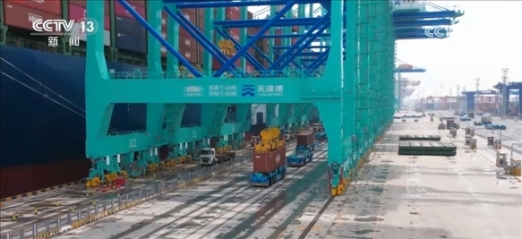 在天津港北疆港區(qū)智能化集裝箱碼頭,隨著貨輪的靠港,長達15.6米的無人駕駛運輸機器人就忙碌起來。此時,在智控中心里裝卸操控、車輛調度,一個個指令通過鍵盤、按鈕精準傳達到碼頭。