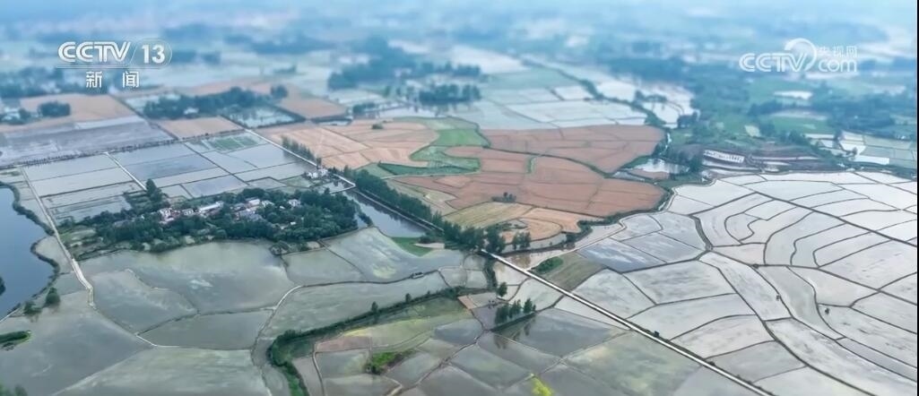 現(xiàn)在您看到的是河南信陽(yáng)淮河以南的水稻插秧現(xiàn)場(chǎng)。插秧機(jī)在田間穿梭,一株株茁壯的秧苗被整齊有序地植入田間,一會(huì)兒工夫就插滿了整塊稻田??罩懈╊?,一臺(tái)臺(tái)插秧機(jī)在農(nóng)機(jī)手的操控下好似一把把畫刷,在稻田上輕輕暈染,繪就丹青。而同在信陽(yáng),淮河以北的麥田里,則是金色的麥浪翻滾起伏,收割機(jī)馳騁田間,飽滿的麥穗被卷入機(jī)艙,經(jīng)過(guò)收割、脫粒,顆粒歸倉(cāng)。