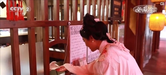 在宋城景區(qū)入口處的漢服妝造館里,游客們正在挑選服裝。穿上漢服,游客們就可以到景區(qū)的打卡點,兌換宋代紙幣——交子,體驗宋代人的日常生活。