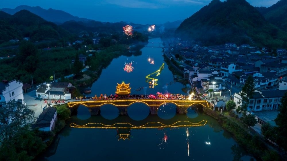 2023年6月16日,在安徽省寧國(guó)市胡樂鎮(zhèn),“魚燈”“河燈”和“龍燈”相互輝映。胡樂鎮(zhèn)的“魚燈”“河燈”“龍燈”表演歷史悠久,每逢佳節(jié),村民們就自發(fā)組織起來在鄉(xiāng)村巡回表演。