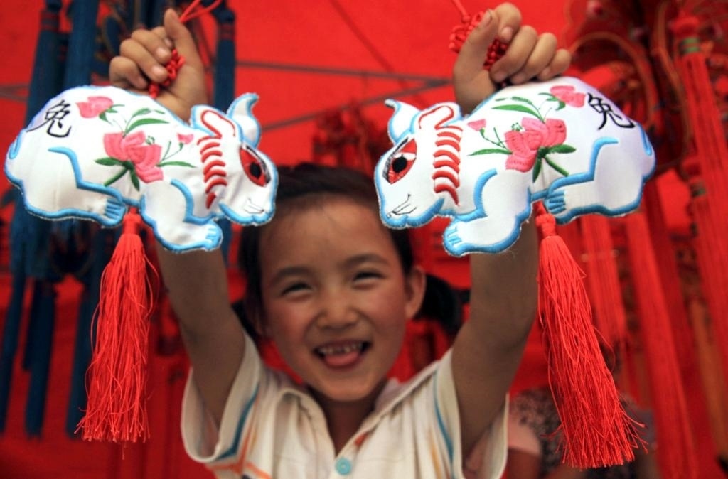 2011年6月5日,在有“香包之鄉(xiāng)”之稱的甘肅慶陽(yáng)香包民俗文化節(jié)香包展棚里,一名小朋友展示玉兔香包。