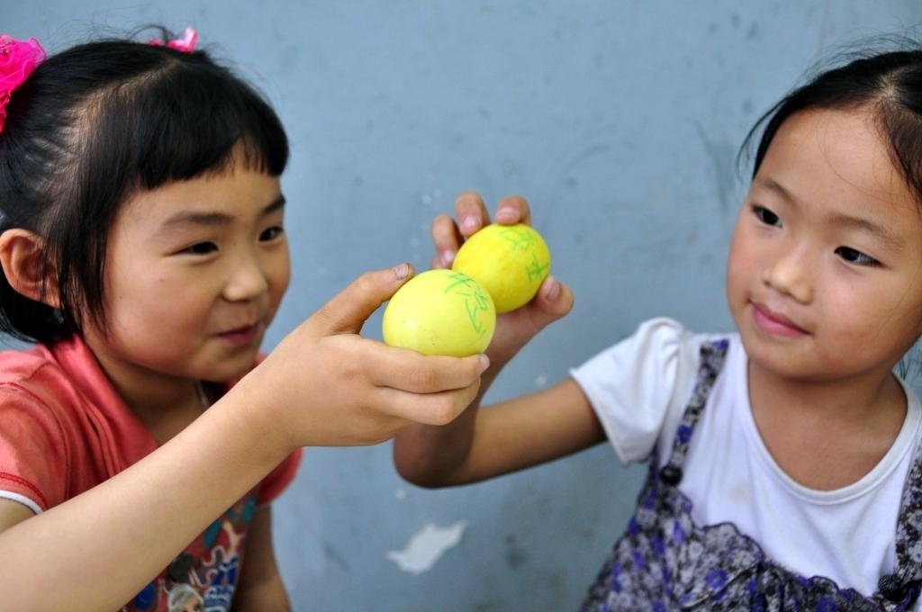 2010年6月13日,福建省莆田市城廂區(qū)第一實(shí)驗(yàn)小學(xué)舉行端午節(jié)傳統(tǒng)習(xí)俗“撞虎蛋”體驗(yàn)活動(dòng)。學(xué)生們?cè)诮?jīng)五味草煮過的鴨蛋上寫下愿望,然后兩兩相撞,共祈今后更加平安、健康、聰明。這是兩位學(xué)生拿著寫有各自愿望的“虎蛋”相撞。