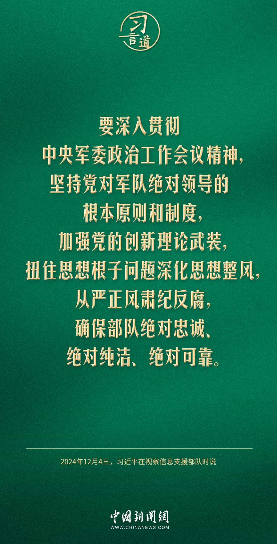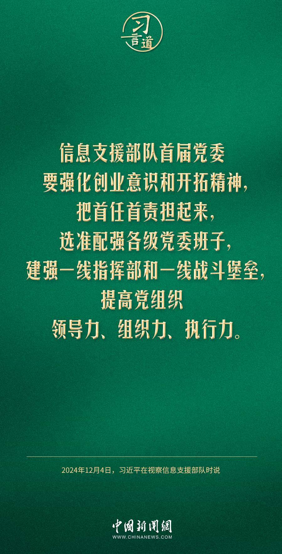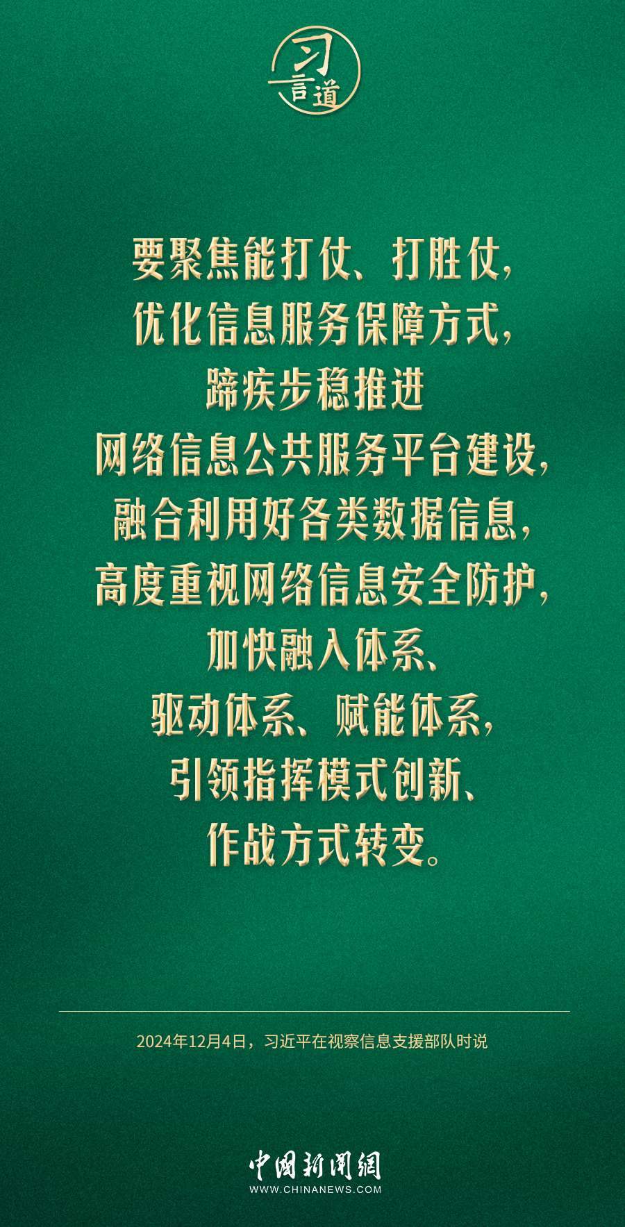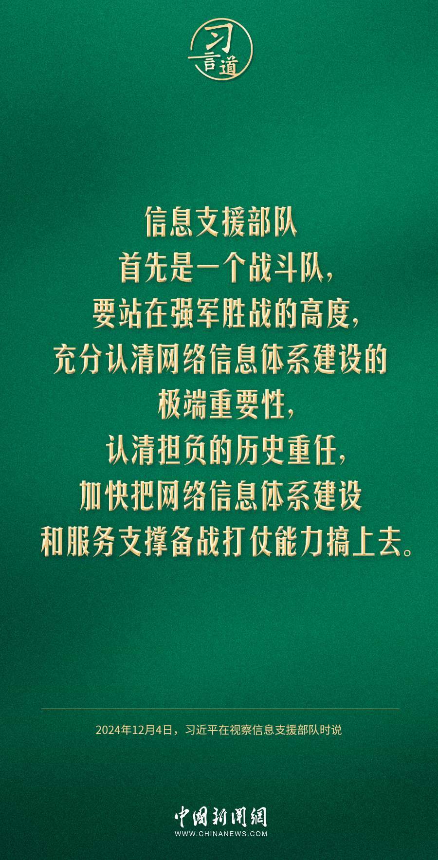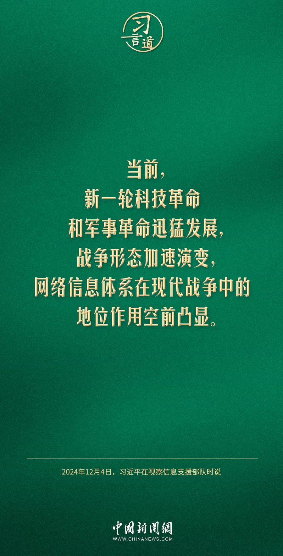 中共中央總書記、國家主席、中央軍委主席習近平4日視察信息支援部隊,代表黨中央和中央軍委,對信息支援部隊第一次黨代表大會的召開表示熱烈祝賀,向信息支援部隊全體官兵致以誠摯問候。習近平指出——