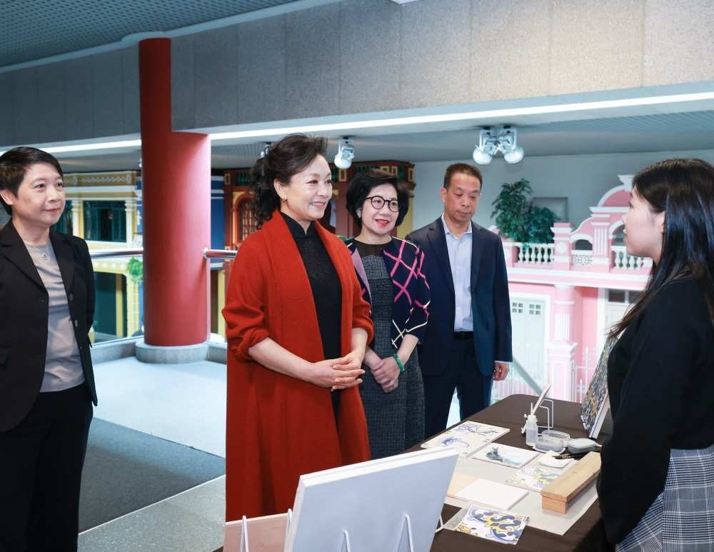 12月19日上午,國(guó)家主席習(xí)近平夫人彭麗媛在澳門特別行政區(qū)行政長(zhǎng)官賀一誠(chéng)夫人鄭素貞陪同下,來(lái)到澳門博物館參觀。彭麗媛仔細(xì)察看館藏文物,深入了解澳門的歷史變遷和中西交融的建筑、行業(yè)、文化生活等情況,同當(dāng)?shù)卮纱u畫制作、木雕等非遺傳承人親切交流。