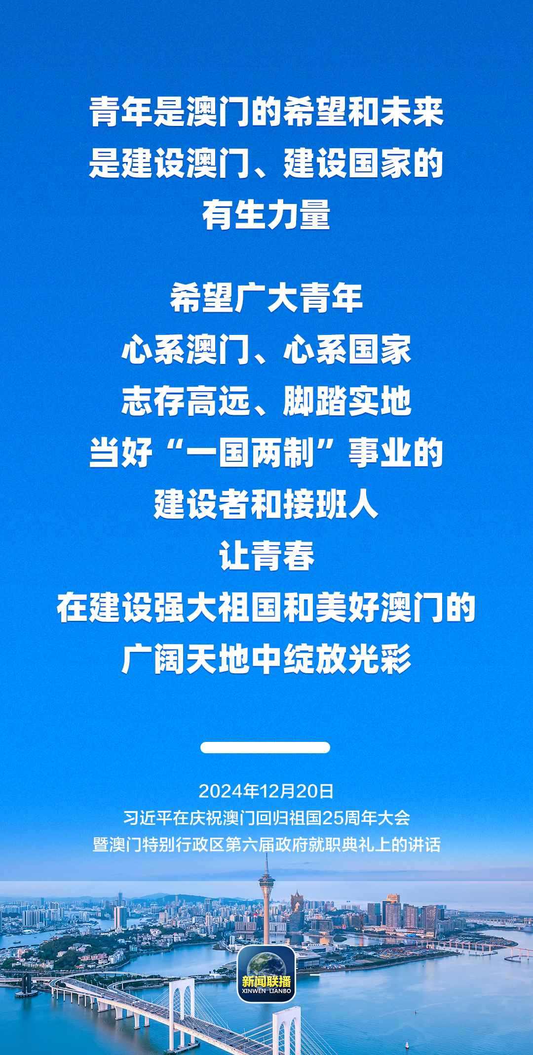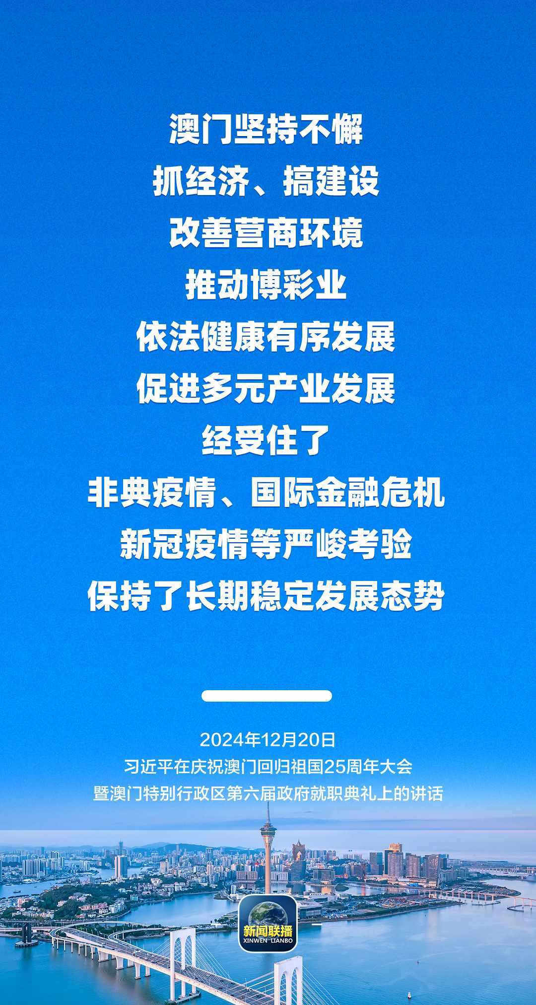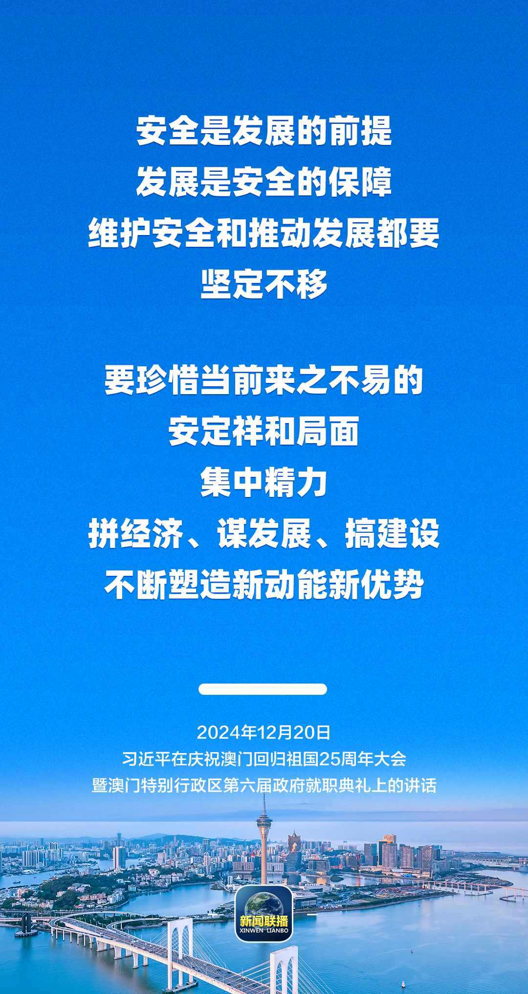 習近平強調,只要全面準確、堅定不移貫徹“一國兩制”方針,有特別行政區(qū)政府和社會各界共同努力,有偉大祖國作堅強后盾,澳門一定能打開發(fā)展新天地、不斷創(chuàng)造新輝煌,一定能為以中國式現(xiàn)代化全面推進強國建設、民族復興偉業(yè)作出更大貢獻。