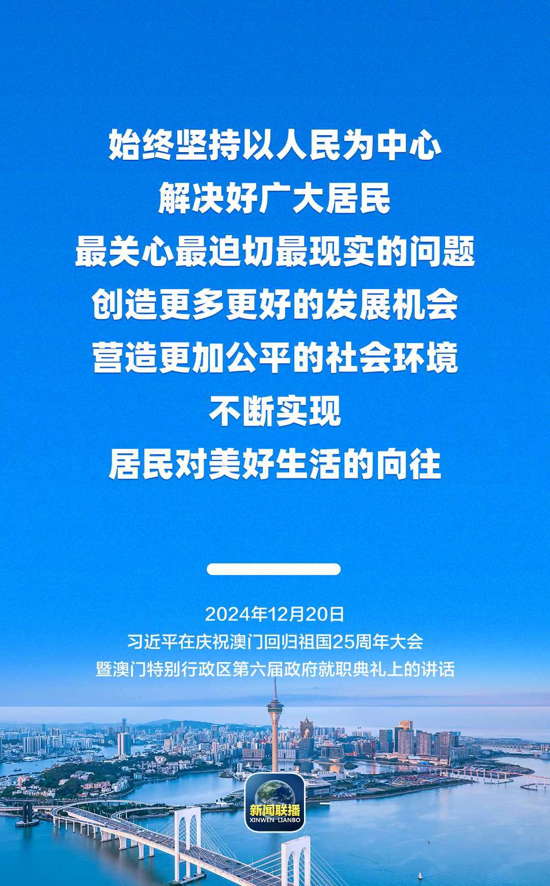 12月20日上午,慶祝澳門回歸祖國25周年大會暨澳門特別行政區(qū)第六屆政府就職典禮舉行。中共中央總書記、國家主席、中央軍委主席習近平出席并發(fā)表重要講話。