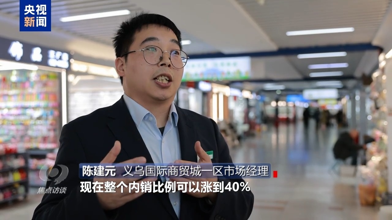 義烏國際商貿(mào)城一區(qū)市場經(jīng)理 陳建元:我們有一個統(tǒng)計,拿我們的飾品行業(yè)來說,經(jīng)過這幾年培育,直播電商的快速發(fā)展,有些經(jīng)營戶轉(zhuǎn)型,現(xiàn)在整個內(nèi)銷比例可以漲到40%,比例還是有一個很明顯的提升。