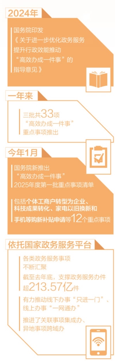 政府工作報告提出,“健全‘高效辦成一件事’重點事項清單管理和常態(tài)化推進機制,完善覆蓋全國的一體化在線政務服務平臺。”