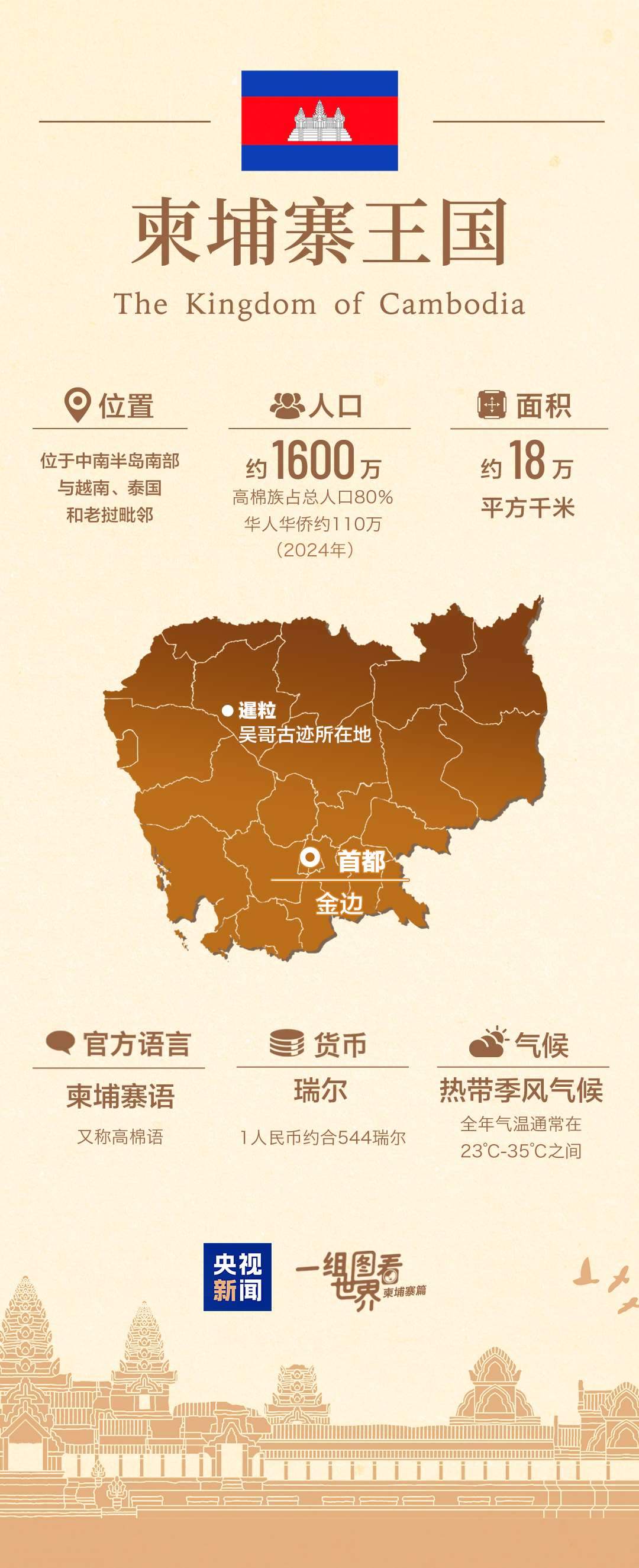從國旗上的千年古跡吳哥窟,到湄公河畔會“呼吸”的洞里薩湖;從元代周達(dá)觀筆下的《真臘風(fēng)土記》,到與中國結(jié)下深厚情誼的西哈努克;從共建“一帶一路”的金港高速公路,到“鉆石六邊”合作架構(gòu)不斷充實……通過一組圖,帶您了解中國的這個“鐵桿”朋友——柬埔寨↓↓↓