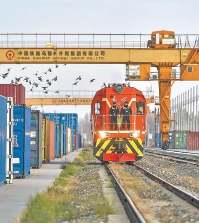 一列中歐班列緩緩駛?cè)胄陆魻柟硅F路口岸站。