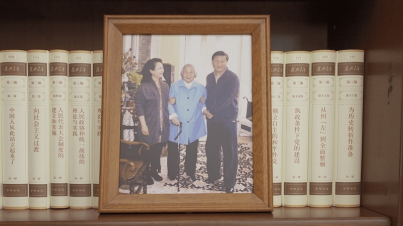 △ 習(xí)近平辦公室的書(shū)架上放著一張照片,照片中他和愛(ài)人彭麗媛攙扶著母親。