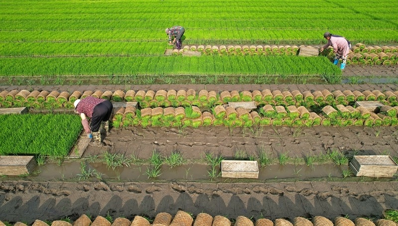 6月19日,在江蘇省連云港市東??h張灣鄉(xiāng)張灣村秧板田里,農(nóng)民起水稻秧苗準備進行機插作業(yè)(無人機照片)。